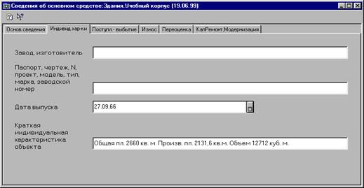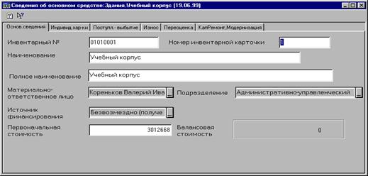 После такого рода предварительной настройки основных параметров программы пользователь может немедленно приступить к вводу хозяйственных операций по учету основных средств. 3.2. Ввод входящей информации Справочник "Основные средства" является прообразом картотеки основных средств. Программа предусматривает два варианта ввода информации в справочник: q справочная информация подготавливается предварительно, а затем осуществляется ввод операций и документов; q справочная информация вводится непосредственно во время ввода бухгалтерских операций и документов. Рассмотрим первый вариант, когда ввод справочной информации об объекте предваряет ввод операций. Выполним ввод сведений об инвентарном объекте основных средств в справочник.