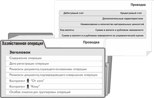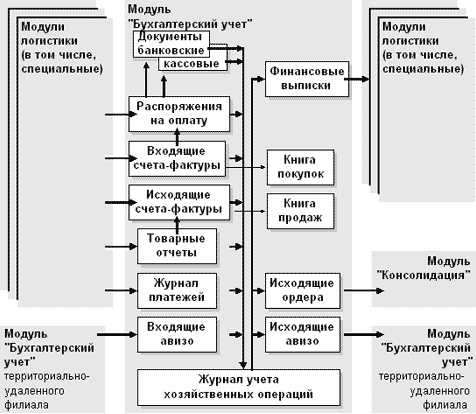 Рис. 1. «Внешние информационные связи приложения «Бухгалтерский учет»Распоряжение на оплату представляет собой основание для подготовки банковского или кассового документа, который, в свою очередь, отрабатывается в журнале учета хозяйственных операций. Однако существует и другой вариант отработки, так как Система не требует обязательной электронной регистрации всех документов. Так, по "электронному" распоряжению об оплате может быть сформирован только "бумажный" документ. Тогда основанием для регистрации в Системе хозяйственной операции выступает само распоряжение об оплате. Товарный отчет позволяет избежать регистрации в Системе отдельных документов по каждой хозяйственной операции. Например, в торговых залах магазина работа может вестись без выписки документов по каждой операции. В других случаях документы (счета, накладные и т.п.) выписываются, но не регистрируются сразу в Системе. После завершения рабочего дня (смены или иного периода) составляется товарный отчет, который регистрируется вручную или автоматизированно, например, в приложении логистики, а затем отрабатывается в учете при помощи бухгалтерского приложения Системы. Входящее и исходящее авизо обеспечивают автоматизированный процесс передачи и отработки в учете данных о хозяйственных операциях внешних подразделений (филиалов) Вашей организации. Финансовая выписка представляет собой выборку из журнала учета хозяйственных операций за некоторый период времени, сделанную по определенным правилам и поступающую в другие приложения Системы ПАРУС. Таким образом, пользователь приложения (например, логистики) получает возможность отследить прохождение отработки своих документов в бухгалтерском учете и перенести информацию из финансовой выписки в специализированные учетные регистры (например, в журнал платежей). Объекты учета и учетные регистры модуляОбъектами бухгалтерского учета являются имущество предприятия, его обязательства и информация об их движении Данные в денежном выражении об остатках имущества и об обязательствах предприятия хранятся в Системе в регистре "Остатки средств по счетам". Информация в этом регистре хранится отдельно для каждого синтетического счета бухгалтерского учета, аналитического счета, подразделения балансовой единицы, а также по каждой валюте. Также в Системе имеются регистры "Остатки материальных ценностей", "Дебиторская/кредиторская задолженность" и "Инвентарная картотека". В этих регистрах ведется учет остатков: товарно-материальных ценностей, обязательств по отношению к дебиторам/кредиторам, основных средств. Однако эти регистры вторичны по отношению к регистру остатков средств по счетам и позволяют детализировать хранящуюся в нем информацию. Остатки на начало первого с момента начала эксплуатации Системы учетного периода вводятся в Систему вручную. Остатки на конец очередного периода рассчитываются автоматизированно при его закрытии по данным об остатках на начало периода и об оборотах средств, материальных ценностей и обязательств. Затем эти остатки переносятся на начало следующего учетного периода. Информация о движении средств, материальных ценностей и обязательств с дебиторами/кредиторами накапливается в регистре, который называется «Журнал учета хозяйственных операций». Журнал учета хо