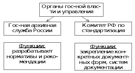 Рис. 1.2.1 Органы государственной власти и управления документацией Таким образом, Архивная служба и Комитет по стандартизации являются основными ведомствами, регулирующими документацию в общегосударственном масштабе. Как правило, они действуют в тесном контакте при решении всех основных вопросов управления документацией и совершенствования делопроизводства. Им принадлежит определение совершенствования документации и организации работы с ней. В любой организации должно быть четкое разграничение функций и обязанностей между сотрудниками в соответствии с их квалификацией и служебным положением, в том числе и в сфере управления документацией. В структуре работников должна быть учтена численность сотрудников делопроизводителей службы по отношению к общей численности работников, или по количественным нормам выработки в единицу времени. Подготовка собственных нормативных и методических документов по этому направлению руководства документацией, а также координация, экспертиза и утверждение работ сторонних организаций в течение последних десятилетий закреплены за Государственным комитетом по труду и социальным вопросам ( в настоящее время - Министерство труда). Документационное обеспечение - важнейшая сторона деятельности любого учреждения, организации, предприятия. Законодательство РФ регламентирует общие принципы организации документационного обеспечения деятельности физических (граждан) и юридических лиц. Регулируя гражданские правоотношения, Гражданский кодекс устанавливает виды и разновидности документов, создаваемых в целях фиксации актов гражданских взаимоотношений, регистрации фактов их возникновения или прекращения, подтверждения правоотношений и др. Основными из них являются: 1. Закон Российской Федерации “О стандартизации” 2. Федеральный закон РФ “Об информации, информатизации и защите информации” 3. Федеральный закон “Об участии в международном информационном обмене” 4. Закон РФ “О государственной тайне” 5. Закон РФ “Об Архивном фонде РФ и архивах” Закон Российской Федерации “О стандартизации” от 10 июня 1993 года № 5154-1 устанавливает правовые основы стандартизации в Российской Федерации, обязательные для всех государственных органов управления, предприятий и предпринимателей, общественных объединений, и определяет меры государственной защиты интересов потребителей и государства посредством разработки и применения нормативных документов по стандартизации. Закон устанавливает порядок проведения работ по стандартизации, виды документов по стандартизации и их применение, осуществление государственного контроля и надзора за соблюдением требований государственных стандартов, ответственность за нарушение положений закона, а также порядок финансирования работ по стандартизации и некоторые другие аспекты. Федеральный закон РФ “Об информации, информатизации и защите информации” от 20 февраля 1995 года № 24-Ф3 устанавливает, что информационные ресурсы (документы и массивы документов) являются объектами отношений физических, юридических лиц, государства и защищаются законом наряду с другими ресурсами. Законом устанавливается правовой режим создания, хранения и использования информационных ресурсов, в частности: порядок документирования информации; право собственности на отд