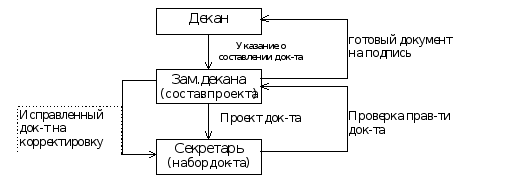 Если документ просто проходит от подразделения к подразделению, то после подписания (6, табл. 3.2.2.) идет передача его в нужное подразделение. Более развернутая схема создания и движения документа (приказа) показана на рис. 3.2.3