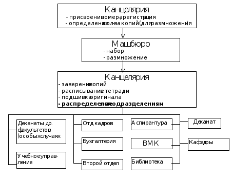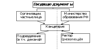 При поступлении в канцелярию документов из министерства - происходит регистрация их и передача ректору университета. Ректор ставит на документах свою резолюцию и через секретаря отдает их обратно в канцелярию, после чего эти документы разносят для исполнения. Все входящие документы обязательно проходят регистрацию в канцелярии университета (см.рис. 3.2.1)