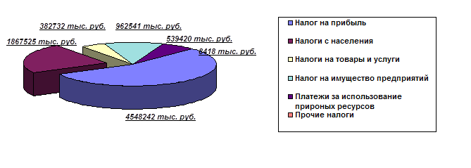* Поскольку сумма начисленного дохода превысила 20 000 руб., то, начиная с марта 2001 г. стандартные вычеты не предоставляются. ** Поскольку выплаченный доход превысил 15000 руб., начиная с августа 2000 г. вычет предоставляется в сумме 83,49 руб. (1 МРОГ). *** Поскольку выплаченный доход превысил 50 000 руб., то, начиная с сентября 2000 г. вычеты не предоставляются. Роль налогов с населения в формировании доходной части бюджета Самарской области. Налоги с населения, рассмотренные в данной курсовой работе, являются источником доходов практически для бюджетов всех уровней. Исключение с 2001 г. составляет Федеральный бюджет. До 1997 года в Федеральный бюджет перечислялось 10 процентов от суммы подоходного налога с 01 января 2001 г. 1 процент. В настоящее время налоги с населения, рассмотренные в данной курсовой работе, перечисляются в основном в региональные бюджеты. Для выявления их роли в формировании доходной части я рассмотрим цифровые данные о бюджете субъекта Федерации Самарской области на 2001 год. Налоговые доходы Самарской области (данные в тыс. руб.): 8959320, среди них подоходный налог – 1867527. Таким образом, сумма налогов с населения, перечисляемых в региональный бюджет 1867527 тыс. руб., причем всю эту сумму составляет подоходный налог. Если считать в процентах к налоговым доходам Самарской области, то подоходный налог составляет 23 процента. Таким образом, видно, что в налоговых доходах бюджета Самарской области одно из важнейших мест занимают налоги с населения, в частности «Налог на доходы физических лиц» - 20,8 % (для сравнения наибольший налоговый доход причитается на налог на прибыль – 50,8 процентов). Для наглядности представим данные в диаграммах: Распределение налогов в налоговых поступлениях в бюджет Самарской области[3]