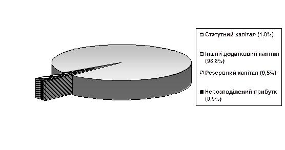 Як видно з таблиці 3 , більш як втричі зросла величина власного капіталу – з 7 638 тис. грн. до 23 616 тис. грн. Це відбулося за рахунок збільшення іншого додаткового капіталу на 12 375 тис. грн. (дооцінка основних засобів) і нерозподіленого прибутку – 3 243,2 тис. грн.(чистий прибуток за звітний період склав 3 484,3 тис. грн., виплати дивідендів – 241,1 тис. грн.) за незмінної величини статутного та резервного капіталу. Відповідно відбулися зміни і в його структурі (рис. 2)