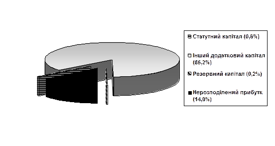 Рис. 2 Структура власного капіталу АТ „Електромех”. Найбільшу питому вагу має інший додатковий капітал , хоча його величина і зменшилася з 96,8% до 85,2%, зросла частка нерозподіленого прибутку з 0,9% до 14%. Відповідно незначно знизилася питома вага статутного та резервного капіталу. Результати аналізу динаміки складу і структури власного капіталу заслуговують позитивної оцінки.