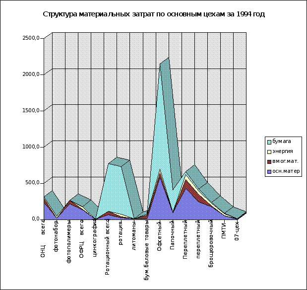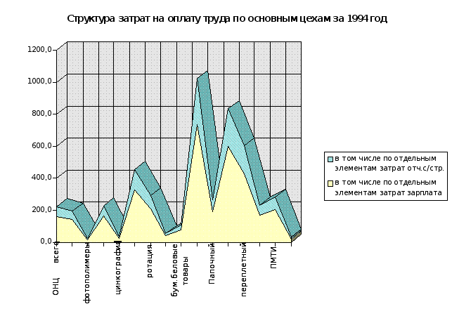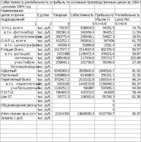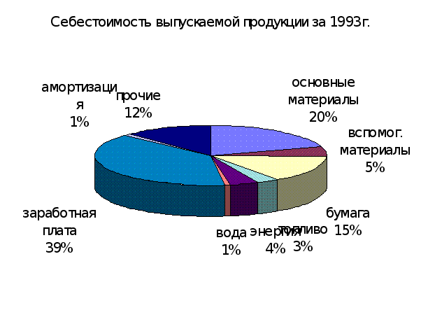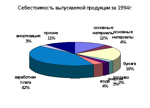 Отраслевой наборный центр - уч.лист снижение в 1994 по сравнению с 1993годом 78.4%; Отраслевой фоторепродукционный центр - фотоформы(шт.) снижение 96.1%; офсетный цех - млн.уч.л-отт рост 113.1% переплетный цех - тыс.экз. снижение 73.2%. Как видно из вышеприведенных данных, практически по всем цехам, за исключением офсетного, имеется снижение выпуска продукции. Это снижение вызывает снижение затрат на предприятии, но с другой стороны общие инфляционные процессы проходившие в тот период при снижении натуральных показателей, дадут рост издержек производства в стоимостном отношении.