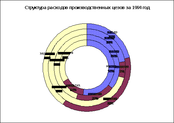 Такое соотношение долей расходов между основными цехами типографии можно признать более или менее устойчивым. Однако при изменении структуры заказов и изменении их тиражей внутри структурных подразделений она безусловно будет изменяться, при сохранении тенденции превышения доли того или другого цеха в общей сумме данного расхода. Только проведение полного анализа расходов по технологической цепочке может дать материал для формулировки предложений по снижению затрат на предприятии. Все расходы , рассмотренные выше являются прямыми расходами и сразу относятся на себестоимость продукции. Рассмотрим структуру общезаводских расходов ГМП «Первая Образцовая типография» за 1994 год, которые по принятой классификации являются косвенными. Они представлены в таблице 3.7. Таблица 3.7. Структура общезаводских расходов за 1994 год (млн.руб.).