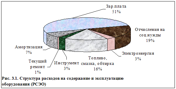 3.3.6. Сводная ведомость РСЭО Таким образом, сметным методом был произведен расчет затрат на содержание и эксплуатацию оборудования. Общая сумма РСЭО составила 27,15 руб. на единицу выпускаемой продукции (325 805,25 руб/год или 27 150,444 руб/мес.). Из рис. 3.1 видно, что наибольшую долю в РСЭО составляет заработная плата обслуживающего персонала (51%) и отчисления на социальные нужды (19%). Топливо, смазочные и обтирочные материалы составляют 16%, амортизация 7%. Малая доля электроэнергии (3%) в составе РСЭО объясняется спецификой производства офисных стульев - производство не является энергоемким. Таблица 3.11 Сводная ведомость расходов на содержание и эксплуатацию оборудования (РСЭО) в руб.