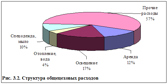 3.4. Общецеховые (общепроизводственные) расходы Общецеховые, или так называемые общепроизводственные расходы (ОПР), включают затраты по содержанию помещений, а также затраты связанные с организацией, обслуживанием и управлением производством. Сюда входит ряд статей: · «Содержание цехового персонала»; · «Содержание зданий, сооружений и инвентаря»; · «Текущий ремонт зданий и сооружений»; · «Амортизация зданий, сооружений и инвентаря»; · «Расходы по охране труда»; · «Возмещение износа малоценного и быстро изнашивающего инвентаря»; · «Прочие затраты». ОПР являются условно-постоянными затратами, т.к. они напрямую не зависят от объема выпуска продукции. Примером тому может служить арендная плата или заработная плата директора. Эти выплаты будут производиться в полном размере даже при значительном снижении производства продукции. На практике в большинстве случаев рассчитывается смета общецеховых расходов и делится на заработную плату основных производственных рабочих. Таким образом, находится процент накладных общецеховых расходов для отнесения их стоимости на единицу готовой продукции. Если объем производства будет падать, то пропорционально уменьшится и заработная плата основных рабочих. В этом случае отношение суммы общецеховых расходов и заработной платы основных рабочих будет больше, чем в первом случае. Рассчитаем некоторые из вышеперечисленных статей общецеховых расходов для предприятия по производству офисных стульев ООО «Падишах-Комфорт». Как уже было сказано выше, помещение предприятие ООО «Падишах-Комфорт» арендует у ОАО «КАМАЗ» (ОАО «КАМАЗ» сдает неиспользуемые и простаивающие помещения и оборудование). Ежемесячно начисляется арендная плата, которая уплачивается ОАО «КАМАЗ». Арендная плата включает в себя сумму амортизации здания, налог на имущество и арендный процент. Расчет ведется именно таким образом (а не через сумму арендной платы на 1 кв.м.), потому что наше предприятие занимает данное небольшое здание целиком и другие арендаторы отсутствуют. Расчет арендной платы здания: Балансовая стоимость здания - 500 000 руб. Накопленный износ - 150 000 руб. Остаточная стоимость (разница балансовой стоимости и накопленного износа) = 500 000 руб. – 150 000 руб. = 350 000 руб. Сумма амортизации (1% от балансовой стоимости) = 500 000 руб. * 0,01 = 5 000 руб/год. Налог на имущество (2% от остаточной стоимости) = 350 000 руб. * 0,02 = 7 000 руб/год. Арендный процент (0,01% от балансовой стоимости) = 500 000 руб. * 0,0001 = 50 руб/год. Арендная плата (в год) = сумма амортизации + налог на имущество + арендный процент = 5 000 + 7 000 + 50 = 13 050 руб/год Арендная плата (в мес.) = 13 050 руб/год / 12 мес = 1 087,5 руб/мес. Арендная плата (на ед.) = 1 087,5 руб/мес / 1000 шт. = 1,09 руб/ед. Сумма затрат на освещение помещений (световая электроэнергия) была рассчитана в п. 3.3.1 и составила 17 602,79 руб/год (1 466,90 руб/мес.) или 1,47 руб. на единицу продукции. Расход средств на отопление определяется на основе соответствующих норм и нормативов исходя из объема отапливаемого помещения и продолжительности отопительного сезона в году: · нагрузка на объем помещения (9,2 т. м. куб.) = 0,004 Гкал/час; · время использования: 8 мес/год по 30 дн/мес (24 час/сутки) = 5760 час/год; · тариф теплоэнергии – 158 руб за Гкал/час; · сумма затрат на теплоэнергию в год: 0,004 * 5760 * 158 = 3640,32 руб/год; · сумма затрат на теплоэнергию в месяц: 3640 / 12 = 303,36 руб/мес; · сумма затрат на т