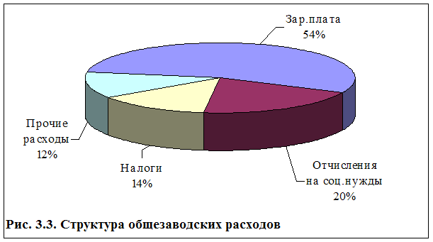 Таким образом, общезаводские расходы на единицу выпускаемой продукции составляют 33,21 руб. Процент же общих накладных общезаводских расходов к заработной плате основных рабочих составляет: 33,21 руб. / 50,2 руб. = 66 %. Наибольшую долю в общезаводских расходах составляет заработная плата (54%).