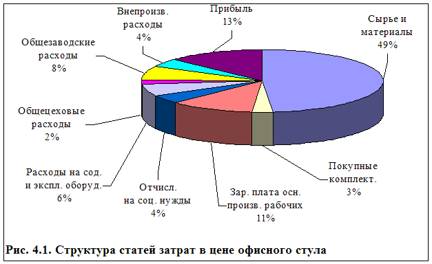 Прочие производственные расходы в данном расчете отсутствуют, т.к. все возможные затраты были нами учтены в статьях общецеховых и общезаводских расходов. 3.6. Внепроизводственные (коммерческие) расходы К внепроизводственным в основном относятся коммерческие расходы, такие как: · расходы на рекламу (в том числе в печатных изданиях, телевизионная реклама, радиореклама, реклама на щитах и световых экранах); · расходы на оформление буклетов своей продукции; · расходы на проведение маркетинговых исследований и поиск новых покупателей; · расходы на создание собственных торговых точек; · оплата услуг юриста, нотариуса при заключении договоров и др. Внепроизводственные расходы считаются процентом от производственной себестоимости. Производственная себестоимость на офисные стулья составляет 364,47 руб/ед. Процент внепроизводственных расходов примем равным 5%. Размер внепроизводственных расходов на ед. продукции: 364,47 руб/ед. * 5% /100 = 18,22 руб/ед. 4. Расчет общей суммы издержек и определение цены продукции ООО «Падишах-Комфорт» Цена продукции определяется как сумма общих издержек производственного и непроизводственного характера и прибыли. Прибыль определим через рентабельность, т.е. через процент к полной сумме издержек. Полная себестоимость производства офисных стульев составляет 382,69 руб. на единицу товара. Допустим, что рентабельность составляет 15%. Производство и реализация одного офисного стула модели «ZIG-ZAG» приносит прибыль в размере: 382,69 * 15% /100 = 57,40 руб. Таким образом, цена нашей единицы продукции составит 440,09 руб. (без НДС). (Рыночная цена аналогичного офисного стула - 450 руб. без НДС). Таблица 4.1 Калькуляция на стул офисный модели «ZIG-ZAG» ООО «Падишах-Комфорт» в руб.