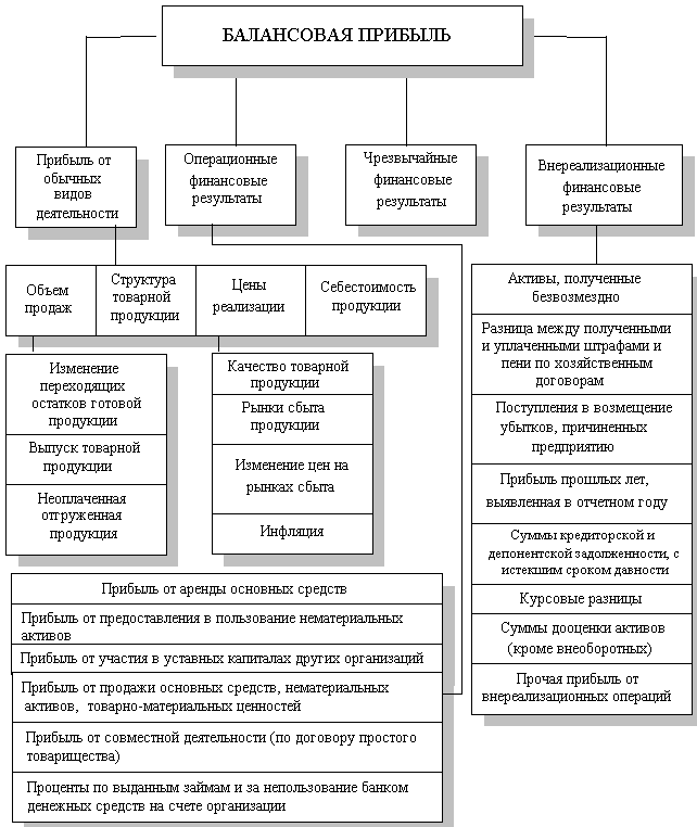 этапы: Источники информации: накладные на отгрузку продукции, данные аналитического бухгалтерского учета по счету продаж и счетам «Прибыли и убытки», «Нераспределенная прибыль, непокрытый убыток», форма бухгалтерской отчетности №2 «Отчет о прибылях и убытках», данные финансового плана. В анализе используются следующие показатели прибыли: балансовая прибыль, налогооблагаемая прибыль, чистая прибыль. Балансовая прибыль включает в себя прибыль от обычных видов деятельности, финансовые результаты от операционных и внереализационных операций и чрезвычайных обстоятельств. Схема формирования балансовой прибыли представлена на рис. 1. Налогооблагаемая прибыль представляет собой разность между прибылью от обычной деятельности и суммой льгот по налогу на прибыль. Чистая прибыль - это та часть прибыли, которая остается в распоряжении предприятия после уплаты налога на прибыль. 1. Анализ состава и динамики балансовой прибыли В процессе анализа необходимо изучить состав прибыли от обычной деятельности, ее структуру, динамику и выполнение плана за отчетный год. При изучении динамики прибыли необходимо учитывать инфляционные факторы изменения ее суммы. Для этого выручку необходимо скорректировать на средневзвешенный рост цен на продукцию предприятия в среднем по отрасли, а себестоимость товаров, продукции (работ, услуг) уменьшить на их прирост в результате повышения цен на потребленные ресурсы за анализируемый период. Для проведения анализа прибыли по составу и в динамике составляют аналитическую табл. 1. Таблица 1 Анализ состава, динамики и выполнения плана по прибыли