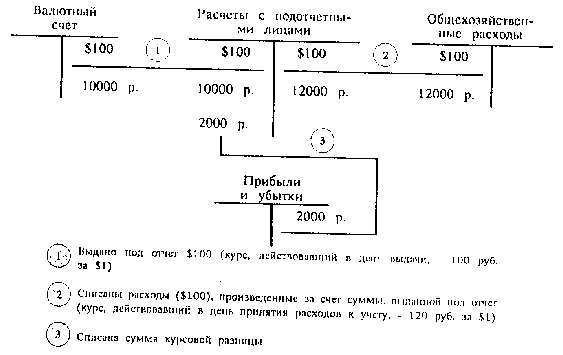 Записи по счету Прибылей и убытков производятся в корреспонденции со следующими счетами: Долгосрочных финансовых вложений, Краткосрочных финансовых вложений - но операциям погашения облигаций и возврата депозитов; Расчетов с поставщиками и подрядчиками - по операциям оплаты приобретенных организацией основных средств, иных материальных ценностей, нематериальных активов, потребленных услуг и оплаты выданных векселей; Расчетов с покупателями и заказчиками - по операциям оплаты отгруженной покупателям (заказчикам) продукции, выполненных работ, оказанных услуг и оплаты полученных векселей; Расчетов по имущественному и личному страхованию - по операциям уплаты организацией страховых платежей; Расчетов с бюджетом - но уплате налогов и неналоговых платежей в иностранной валюте; Расчетов с подотчетными лицами -по операциям погашения сумм, выданных ранее под отчет; Расчетов с учредителями - по выплате доходов, дивидендов от участия в организации; Расчетов с разными дебиторами и кредиторами - по операциям неторгового характера; Расчетов с дочерними (зависимыми) обществами - по расчетам с дочерними (зависимыми) обществами; Внутрихозяйственных расчетов - но расчетам с филиалами и представительствами; Краткосрочных кредитов банков, Долгосрочных кредитов банков, Краткосрочных займов, Долгосрочных займов -• но операциям погашения кредитов и займов, полученных организацией от банков, иных кредитных учреждений и других организаций. В качестве примера приведем записи по расчетам с подотчетными лицами (см. рис.1). Альтернативной описанной выше может быть схема, при которой в течение года образующиеся суммы курсовых разниц учитываются на счете Доходов будущих периодов на специально открываемом для этого субсчете. Записи по счету Доходов будущих периодов производят в корреспонденции с теми же счетами, что и по счету Прибылей и убытков. Выявившийся но окончании отчетного года сальдированный результат по счету Доходов будущих периодов списывается на счет Прибылей и убытков. Таким образом, с точки зрения формирования конечною финансового результата деятельности организации описанный порядок никак не влияет на него в сравнении с непосредственным отнесением курсовых разниц на счет Прибылей и убытков.
