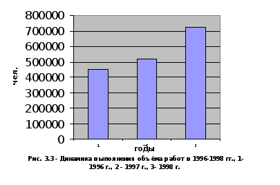 рис 3.1 ![]() Н руб а основе представленных в таблице 3.1 данных построим графики изменения численности, средней месячной заработной платы персонала и объёма выполненных работ по объединению ГУП «Алтайавтодор» ( рис.3.1, 3.2, 3.3 ). Как видно из диаграммы численность работающего персонала имеет тенденцию к увеличению засчет ежегодного увеличения объема работ, график которых изображен на рис3.3.