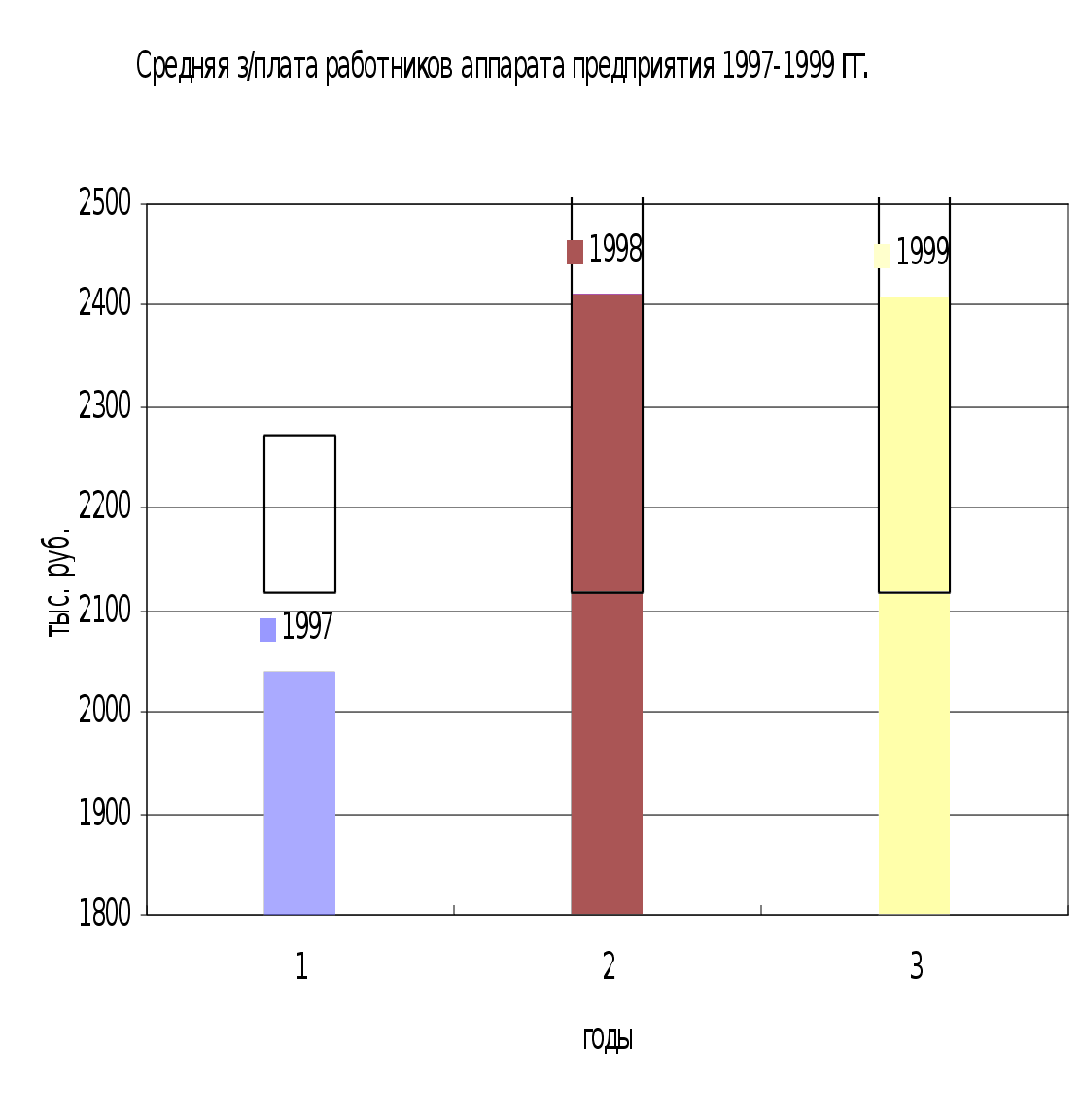Средняя заработная плата за 9 месяцев 1998 г., по сравнению с 9 месяцами 1997 г. выросла на 18,5% или на 2547 руб., средняя заработная плата 9 месяцев 1999 г. в сравнении с этим же периодом 1997 г. выросла на 57,3%, т.е. на 7892 руб., а в сравнении с 1998 г. – на 32,8 % или на 5345 руб. Исходя из этого можно сделать вывод о том, что наблюдается рост средней заработной платы.