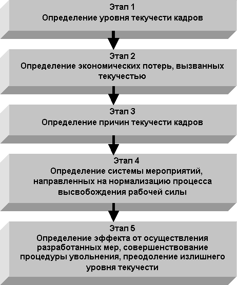 Поэтапно приведение уровня текучести к приемлемому значению можно представить в частности через возможность планирования предстоящих увольнений, увязки процессов увольнения с процессами найма, помощи увольняемым работникам (аутплейсмента). Для решения этих и других вопросов, которые будут обозначены после, необходимо исходить из конкретной ситуации на предприятии. Рассматриваемая ниже методика предполагает упорядоченную поэтапную деятельность, осуществление которой следует возложить непосредственно на кадровую службу предприятия. Вся деятельность по управлению текучестью кадров в рамках общего управления персоналом можно представить в виде следующих последовательных стадий: Рисунок 1 - Этапы управления текучестью кадров Рассмотрим содержание каждого из этапов более подробно. 1 ЭТАП. Определение уровня текучести кадров. На этой стадии необходимо ответить на главный вопрос - является ли уровень текучести настолько высоким, что приводит к необоснованным экономическим потерям, недополучению прибыли предприятием? Отмеченный выше уровень в 3-5% не должен восприниматься как некий индикатор, поскольку профессиональная мобильность на конкретном предприятии формируется под воздействием совокупности факторов – отраслевая принадлежность, технология производства, трудоемкость работ, наличие/отсутствие фактора сезонности в производственном цикле, стиль руководства, уровень и принципы корпоративной культуры. Поэтому при определении индикативного уровня следует провести анализ динамики трудовых показателей предприятия за возможно больший период времени (последние годы), выявить наличие и величину сезонных колебаний текучести. 2 ЭТАП. Определение уровня экономических потерь, вызванных текучестью кадров. Это очень важный этап и в то же время один из наиболее трудоемких, поскольку для его проведения необходимы специальные данные. Дело в том, что с началом проведения в стране экономических реформ одним из первых управленческих аспектов, которым стали пренебрегать предприятия, стало нормирование труда, изначально призванное выявлять резервы производительности труда. Предприятий, на которых ведется учет затрат рабочего времени, разрабатываются, соблюдаются и регулярно пересматриваются трудовые нормы, на сегодняшний момент можно назвать единицы. Однако проблемой следует заниматься в любом случае, поэтому необходимо хотя бы приблизительно оценить величину потерь, которая в любом случае в основном складывается из следующих показателей: · потери рабочего времени — временной интервал между увольнением сотрудника и принятием нового работника, в течение которого незаполненное рабочее место не производит продукцию; · потери, вызванные проведением процедуры увольнения — выплаты выходных пособий увольняющимся работникам (если они производились). Здесь можно также учесть законодательные особенности начисления выплат, производимым по разным основаниям увольнения. При сокращении штатов и при увольнении по собственному желанию суммы выплат будут разными. Консультацию по данным вопросам может дать юридическая служба (юрист) предприятия Т.е. можно рассчитать “переплаченные” средства и также включить их в потери; — затраты рабочего времени сотрудника кадровой службы, оформляющего увольнение; · потери, связан