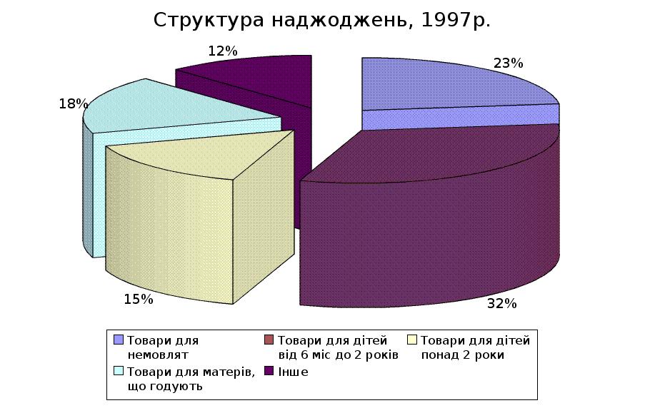 Структура надходжень проілюстрована в додатку 5, де найбільшу частку займають товари для малюків від 6 місяців до 2 років, що обумовлено спеціалізацією діяльності фірми. На думку провідних спеціалістів відділу маркетингу фірми “Глобус Лтд” саме цей сегмент ринку найбільш придатний для експансії, тому саме сюди спрямовані головні зусилля. Але інші товарні групи також розглядалися як досить перспективні, у зв’язку з, хоча і незначним, але покращанням матеріального стану та постійною увагою до маленьких дітей та їх батьків. Фірма має можливість маневрувати частками в структурі в залежності від стану попиту та пропозиції на ринку, що дозволяє страхувати ризик стрімкого падіння попиту на одну з товарних груп: умови контрактів дозволяють здійснити обмін товарів з постачальниками в разі несприятливої ситуації.