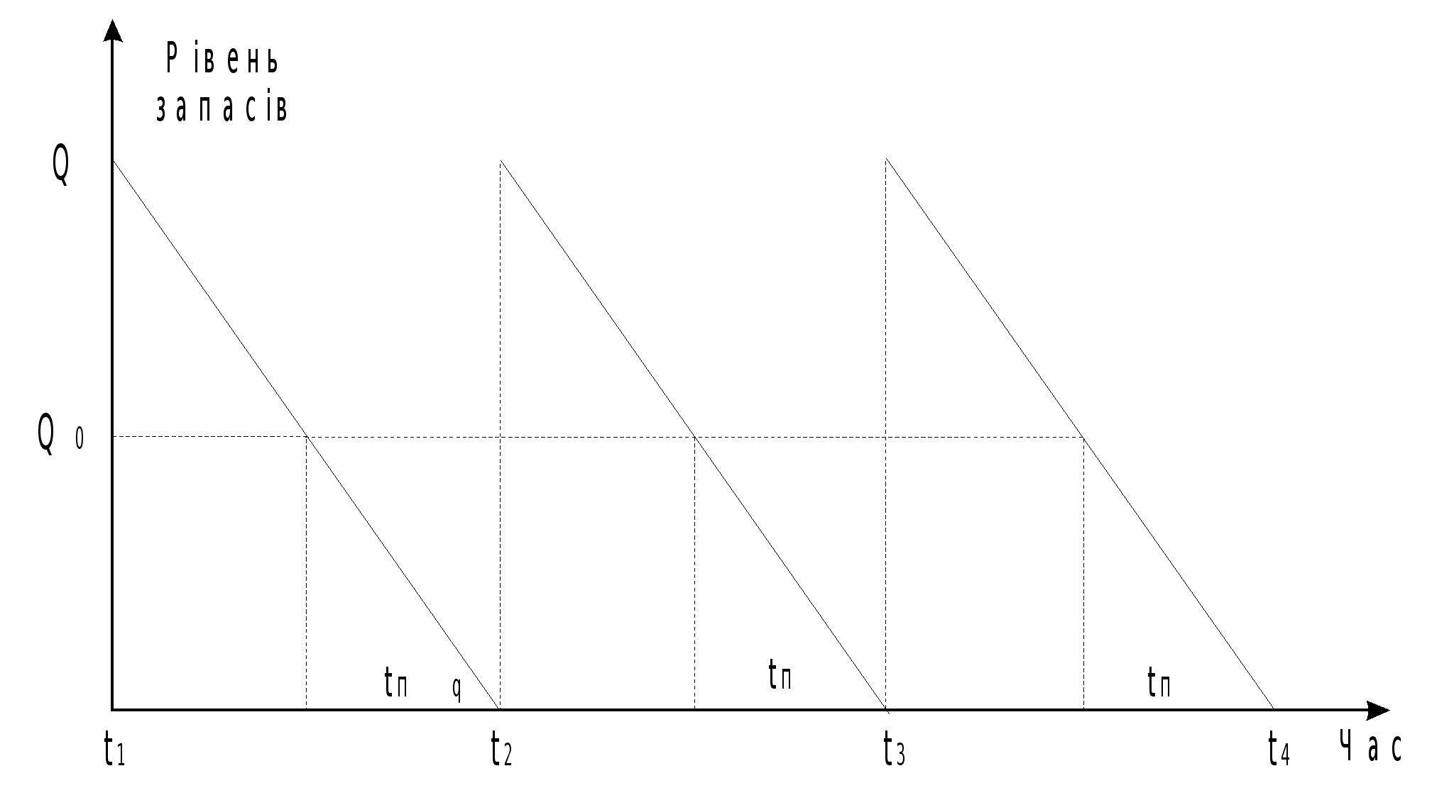 В рамках перерахованих допущень, процес формування і реалізації товарних запасів описується динамічною схемою, яка наведена на мал. 2. |