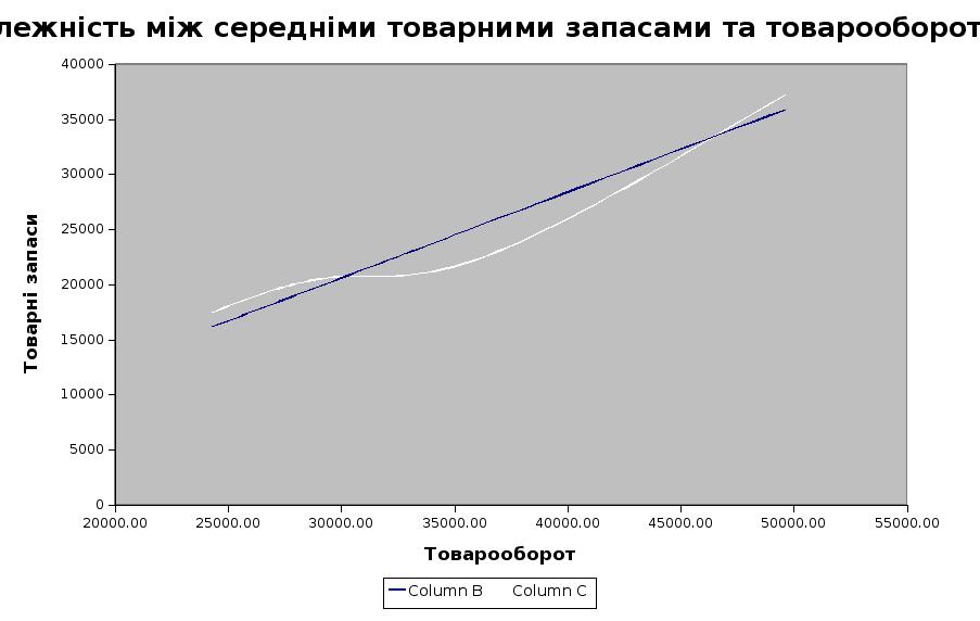 Об’єм та структура товарообороту є одним з найважливіших факторів, що впливає на формування товарних запасів. В додатку 6 розраховано і в додатку 7 проілюстрована залежність між середніми товарними запасами та товарооборотом. Отримане рівняння регресії вказує на прямопропорційний характер залежності. Так поступове збільшення товарообороту відображається у підвищенні об’єму товарних запасів. Значення коефіцієнта регресії вказує на те, що товарні запаси зростають меншими темпами ніж товарооборот, що обумовлено оптимізацією рівня товарних запасів та намаганням мінімізувати витрати по зберіганню.
