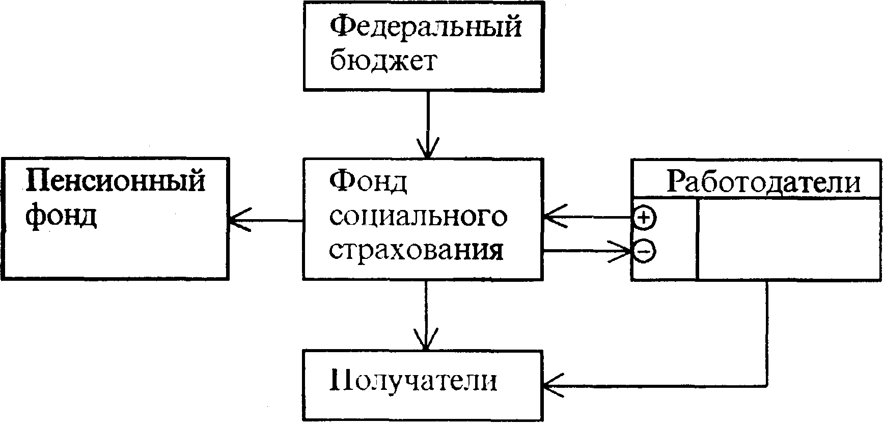 Представленная на рис. 4 блок-схема финансовых потоков, складывающихся в системе социального страхования, дает представление о финансовых взаимоотношениях ее субъектов. В частности, в ней отражено то положение, что большая часть средств социального страхования поступает работникам непосредственно от работодателей, а меньшая (примерно \/4) перечисляется в Фонд социального страхования для перераспределения между отдельными предприятиями, организациями, учреждениями. Из нее видно также и то, что часть поступлений в ФСС осуществляется из федерального бюджета. Это компенсационные поступления по расходам на выплату пособий, санаторно-курортное лечение и оздоровление в соответствии с Законом РФ «О социальной защите граждан, подвергшихся воздействию радиации вследствие катастрофы на Чернобыльской АЭС».