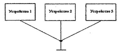 Эта схема наиболее проста. Однако ей присущ недостаток, связанный с протеканием обратных токов различных цепей по общему участку заземляющей цепи. Вследствие этого возможно появление опасного сигнала в посторонних цепях. В одноточечной параллельной схеме заземления этого недостатка нет. Однако такая схема требует большого числа протяженных заземляющих проводников, из-за чего может возникнуть проблема с обеспечением малого сопротивления заземления участков цепи. Кроме того, между заземляющими проводниками могут возникать нежелательные связи, которые создают несколько путей заземления для каждого устройства. В результате в системе заземления могут возникнуть уравнительные токи и появиться разность потенциалов между различными устройствами.