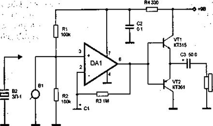 Усилитель звуковой частоты собран на микросхеме DА1 типа К140УД6. Резисторы R1 и R2 задают режим работы микросхемы. Коэффициент усиления определяется значением сопротивления резистора RЗ. Транзисторы VТ1 типа КТ315 и VТ2 типа КТ361 включены по схеме эмиттерных повторителей и усиливают выходной сигнал по току. Нагрузкой усилителя служат головные телефоны ТЭМ-2.