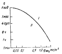Концентрации вредных примесей по-разному оказывают влияние, как на культурные, так и на дикорастущие виды растений. Растения имеют различную чувствительность к примесям как от их концентрации так от продолжительности их воздействия (рис.). Группа экспертов ВОЗ для оценки воздействия SO2 на окружающую среду, человека и растительность рекомендовала пользоваться графиком, приведенным на рис. [10]. Из него следует, что при небольших концентрациях SO2 растения могут повреждаться при больше продолжительности времени воздействия, так, например, при концентрации больше 0.2 мг/м3 растения могут повреждаться в течение месяца. При уменьшении времени воздействия концентрация веществ, приводящих к повреждению, увеличивается, так кратковременное до 5 минут резкое увеличение концентрации (которое может наблюдаться при залповых выбросах и при аварии) может привести к повреждению и гибели растительности. Однако зависимости эти еще недостаточно изучены. Нередко отмечаются случаи повреждения деревьев, особенно хвойных, при весьма малых концентрациях SO2.