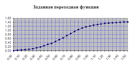 продуктов горения: 3. Удельный расход воздуха на единицу тепла: 4. Удельная плотность газа на единицу тепла: Расчет локальной системы регулирования. 1. Получение передаточной функции объекта по заданной переходной характеристике. Заданная переходная функция (кривая разгона) в графическом виде рис.1. Исходные данные: K об = 1,41; t = 0,3; T =0,85; X (¥) = 1,41; Dt = 0,05 с. (рис.1) . Порядок расчета. 1. Разбивают отрезок времени от момента нанесения возмущения до момента выхода величины x на установившееся значение на равные отрезки времени Dt так, чтобы на каждом участке кривая мало отличалась от прямой. Выбираем Dt = 0,05 с. 2. Составляют табл. 1 и заносят новое время в графу I, а значение x в конце каждого интервала в графу 2. Находят безразмерное значение выходной величины s (iDt), разделив x на Dx (¥) = 1,41 - результат заносят в графу 3. 3. Вычисляют 1 - s (iDt) и вписывают в графу 4. 4. Подсчитывают сумму чисел графы 4 равной 14,1092. 5. По формуле (6) определяют площадь F1. F1 = 0,05 { 14,1092 - 0,5 [ 1 - 0]} = 0,6805 с. 6. Находят время в новом масштабе q = t / F1 и заносят в графу 5. 7. Подсчитывают разность 1 - q и заносят в графу 6. 8. Вычисляют (1 - s) * (1 - q), перемножая числа граф 4 и 6, и заносят в графу 7. 9. Находят сумму чисел графы 7 равной 6,0465. 10. По формуле (7) определяют площадь F2. F2 = 0,6805 * 0,05 { 6,0465 - 0,5 [ 1 - 0]} = 0,1887 с2. 11. Рассчитывают и заносят в графу 8 величину 1- 2*q + q2 / 2. 12. Вычисляют (1 - s) * (1 - 2*q + q2 / 2), перемножая числа граф 4 и 8, и заносят в графу 9. 13. Находят сумму чисел графы 9 равной 1,5303. 14. По формуле (8) определяют площадь F3. F3 = 0,68052 * 0,05 { 1,5303 - 0,5 [ 1 - 0]} = 0,0239 с3. 15. Так как F3 имеет положительное значение, следовательно коэффициенты a3; a2; a1 равны : a1=F1; a2=F2; a3=F3 , то безразмерная передаточная функция имеет вид: