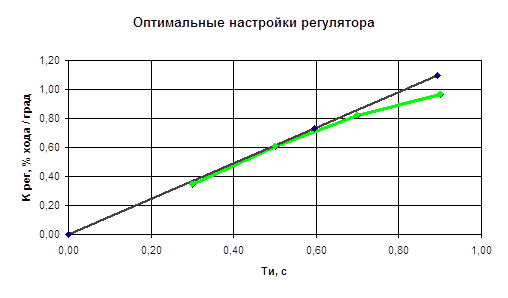. Графический расчет приведен на рис.2. На плоскости настроек регулятора строим зависимость К рег от Т и (рис.5.) и находят точку с наибольшим отношением К рег / T и (точка касания прямой, выходящей из начала координат). Настройки соответствующие, этой точке K рег. oпт. = 0,65 % хода // oC и Т и. oпт. =0,55 c, обеспечивают минимальное значение квадратичного интегрального критерия качества при М = = 1,3. Зависимость К рег от Т приведена на рис.3. (рис.2)