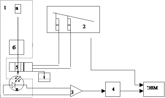 Блок-схема установки для кинетических измерений: Принцип действия ОС–02 состоит в следующем: реагенты под действием давления на поршни подают из шприцев блока 2 в камеру смешения 5, где они смешиваются и смесь попадает в камеру наблюдения, эта подача осуществляется до механического упора. В момент остановки потока реагентов происходит замыкание контакта, расположенного на рычаге, двигающем поршни шприцев в блоке 2, это отмечается на графике и записывается в файле с данными измерения. Луч света, пройдя через монохроматор б, через камеру наблюдения 5 попадает на фотодиод в, сигнал с фотометра усиливается усилителем постоянного тока 3, затем попадает на аналого-цифровой преобразователь АЦП 4, и после этого информация передается в ЭВМ, где и происходит ее обработка. Ход измерения состоит в следующем: Оба шприца заполняются водой и вода запускается в камеру смешения. В это время происходит измерение 100% пропускания (при закрытой крышке фотометра) и 0% пропускания (при открытой крышке фотометра). В шприцы заливаются реагенты. После нажатия кнопки "Enter" на клавиатуре ЭВМ с помощью рычага растворы из шприцев вводят в камеру смешения, замыкается контакт и в ЭВМ поступает сигнал о начале измерения ОС–02. Время измерения задается при вводе количества точек измерения и величины временного интервала между точками. Таким образом, в результате измерения на мониторе изображается временная кривая изменения пропускания, начиная от нажатия кнопки "Ввод" и заканчивая последней точкой измерения. Момент остановки движения потока отмечается вертикальной чертой (меткой). Коэффициент пропускания вычисляется по формуле: