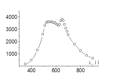 файлов, одновременно находящихся в памяти — 11). Минимальный объем растворов для одного измерения 1 мл, далее порциями по 0,5 мл. 12). Объем камеры измерения 30 мкл. При выборе рабочей длины волны следует учитывать не только зависимость изменения оптической плотности в ходе реакции, но и то, что чувствительность приемника и отношение сигнал/шум АЦП сильно зависит от длины волны, что представлено на рис. 2.2. Видно, что наиболее хорошие результаты могут быть достигнуты в интервале длин волн от 500 до 700 нм. В случае, когда реагенты и продукты реакции поглощают свет вне этого диапазона, следует повышать чувствительность АЦП и проводить усреднение по нескольким кинетическим кривым, снятым в одинаковых условиях.