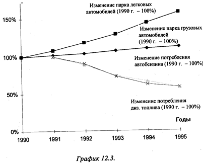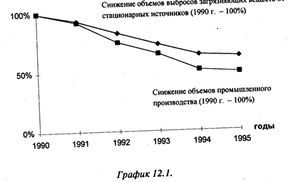 Загрязнение атмосферы Атмосфера испытывает загрязнение в основном от химических веществ, поступающих в нее на различных стадиях производства и утилизации продукции. Эти вещества находятся в газообразном, жидком и твердом (пыль, сажа и т.п.) состоянии. Ввиду большой опасности выделяют также радиоактивное загрязнение веществами (изотопы радона, стронция, плутония), находящимися в форме газов или взвешенных частиц. Кроме того существует тепловое загрязнение, образующееся в результате антропогенной деятельности и влияющее на температурный баланс, загрязнение шумом, образующееся в результате работы техники, транспорта, бытовых приборов и, наконец, — электромагнитное загрязнение из-за функционирования телерадиостанций, радиолокационных установок, линий электропередач высокого напряжения. Загрязнение атмосферы химическими веществами — наиболее существенный фактор общего загрязнения. Как уже говорилось, его источниками могут быть как стационарные установки, так и транспортные средства. Всего от стационарных источников в РФ (как правило, это предприятия) в последнее время выбрасывается более 20 млн т загрязняющих веществ в год, 80% которых находятся в газообразной или жидкой форме. Это — чистый выброс, получающийся после улавливания большей части загрязнителей. Показатель улавливания достаточно высок, он составляет около 75 % от общего количества отходящих загрязняющих элементов. Иными словами, если бы технологий улавливания не существовало бы, ежегодный выброс химических веществ .достиг бы размеров примерно в 100 млн т. Нужно сказать, что объем 'выбросов от стационарных источников в последние годы уменьшается ; (в 1990 г. было выброшено 34 млн т), что в первую очередь является 'следствием падения объемов производства, а не решающих успехов в деле охраны окружающей среды. Однако, как следует из графика1., производство сократилось в большей степени, чем выбросы. Это подтверждает тезис о том, что бороться с загрязнением методами простого закрытия предприятий или сворачивания отдельных отраслей малоэффективно. Без структурной перестройки, изменения технологий оставшиеся предприятия могут даже увеличить выбросы в масштабах страны как абсолютно, так и относительно за счет старения основных средств, в том числе и экологического назначения.