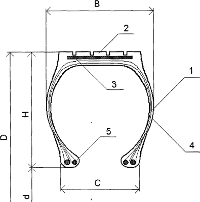 Рис. Основные элементы и размеры шины: 20.1. 1 - каркас, 2 - протектор, 3 - брекер, 4 - боковина, 5 - бортовое кольцо; В - ширина профиля, D - наружный диаметр, d - посадочный диаметр, Н - высота профиля, С - раствор бортов В радиальных шинах направление нитей корда в каркасе совпадает с меридианами, а в брекере угол между нитями и меридианами составляет 60...75°. В настоящее время более 80% выпускаемых в мире шин имеют радиальную конструкцию. По способу герметизации внутренней полости шины делятся на камерные и бескамерные. Бескамерные работают в более благоприятном тепловом режиме благодаря более интенсивной теплопередаче через обод колеса. По соотношению высоты и ширины профиля шины делятся на шесть групп (табл. 20.1). Наблюдается тенденция к дальнейшему снижению профиля.