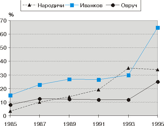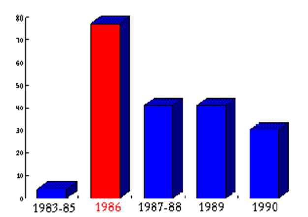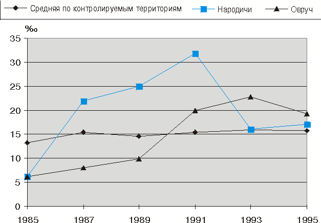 Рис. 9. Перинатальная смертность в контролируемых районах ЛИТЕРАТУРА1. Аклеев А.В., Ава А., Акияма М. и др. Биологическая индикация хронического облучения в отдаленные сроки. // Библиотека журнала "Медицинская радиология и радиационная безопасность" - Хроническое радиационное воздействие: риск отдаленных эффектов. (Материалы 1-го международного симпозиума; г. Челябинск, 9-13 января 1995 года). М.: Изд-во ИЗДАТ, 1996, с. 7 - 19. 2. Андреева Е.А., Хуторская О.Е. Спектральный метод анализа электрической активности мышц. М.: Наука, 1987, 145с. 3. Андреева Е.А., Смирнова С.Н., Хуторская О.Е., Метод выявления ранних признаков облучения людей, подвергшихся воздействию электромагнитных полей СВЧ- диапазона. М.: Ин-т проблем управления 1987. 23с. 4. Андреева Е.А., Торубаров Ф.С., Хуторская О.Е., Смирнова С.Н.,Чесалин П.В.,Электромиографический метод выявления у людей ранних признаков реакции на радиационные воздействия. //Физиология человека. 1990. т 16. 5. Андреева Е.А., Смирнова С.Н., Хуторская О.Е. Электромиографический признак реакции человека на облучение неионизирующими (СВЧ-диапазона) и ионизирующими воздействиями. // Физическая медицина 1992. т2, N1-2 С 16-23 6. Ye.A.Andreeva, S.N.Smirnova and O.Ye Khutorskaya. "Electromyografphical feature of human reaction to irradiation by ionizing sources".J.Human Physiology 1993, N4 7. Ye. A.Andreeva and O.Ye Khutorskaya."Electromyografphical feature of human reaction on influence of non-ionizing and ionizing radiations" Abstract Tenth Congress of the International Society of Electrophysiology and Kinesiology, Charleston, South Carolina USA June 21-24 1994 8. Артамонова Н.О., Бусыгина Н.А., Губский В.И. Науковедческий анализ проблемы нарушений иммунного статуса человека под воздействием экстремальных факторов аварии на Чернобыльской АЭС. // Иммунология, 1993, вып. 2, с.58-60. 9. Бабешко В.Г., Чумак А.А., Базыка Д.А. Иммунологический мониторинг больных острой лучевой болезнью через 12-36 мес. после аварии на Чернобыльской АЭС. //Медицинская радиология. 1990, вып. 12, с.27-30. 10. Большая медицинская энциклопедия. Под редакцией В.В. Петровского, М: Советская энциклопедия, 1981. 11. Дозовые зависимости нестохастических эффектов, основные концепции и величины, используемые в МКРЗ (Международной комиссии по радиологической защите). // Публикации 42-42 МКРЗ. Москва, Энергоатомиздат, 1987. 12. Ильин Л.А., Крючков В.П., Осанов Д.П., Павлов Д.А. Уровни облучения участников ликвидации последствий Чернобыльской аварии в 1986-1987 г.г. и верификация дозиметрических данных. // Радиационная биология. Радиоэкология, 1995, вып.6, с.803-828. 13. Кисельгоф Е.И. Радиация и организм. 14. Конрадов А.А. Статистические подходы к анализу многомерных гетерогенных биологических систем. // Радиационная биология. Радиоэкология. 1994. вып. 6, с. 877 - 886. 15. Корогодин В.И., Кутлахмедов Ю.А. Проблема загрязненных радионуклидами больших территорий. // Медицинская радиология. 1993, вып. 8, с.5. 16. Low doses of ionizing radiation: direct estimates of cancer risk. J. The Lancet v344 pp1039-1043. 17. Оганесян Н.М., Огаджанян Э.Е. и др. Результаты наблюдения за участниками ликвидации последствий аварии на Чернобыльской АЭС. // Медицинская радиология. 1991, вып. 10, с.33-36. 18. Окладникова Н.Д., Токарская З.Б., Мусаткова О.Б. Цитогенетический эффект длительного воздействия инкорпорированного плутония-239 и внешнего гамма-облучения у профессионалов (клиническое исследование). Радиационная биология. Радиоэкология, 1994, вып. 5, с.48 - 52. 19. Пелевина И.И. Адаптивная реакция лимфоцитов крови людей, подвергавшихся хроническому воздействию радиации в малых дозах. // Радиационная биология. Радиоэкология, 1994, вып.6, с.805-81