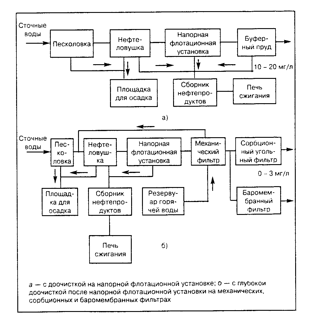 Из механических практическое значение имеют отстаивание, центрифугирование и фильтрование; из физико-механических – флотация, коагуляция и сорбция; из химических – хлорирование и озонирование. Типовые технологические схемы очистки сточных вод от нефтепродуктов показаны на рисунке 1.