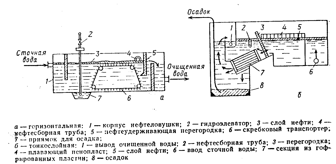 Рисунок 1 – Нефтеловушки. В радиальных отстойниках круглой формы вода движется от центра к периферии или наоборот. Радиальные отстойники большой производительности, применяемые для очистки сточных вод, имеют диаметр до 100 м и глубину до 5 м. Радиальные отстойники с центральным впуском сточной воды имеют повышенные скорости впуска, что обуславливает менее эффективное использование значительной части объема отстойника по отношению к радиальным отстойникам с периферийным впуском сточных вод и отбором очищенной воды в центре. 3.1.2.3 Тонкослойные отстойники Чем больше высота отстойника, тем больше необходимо времени для всплытия частицы на поверхности воды. А это, в свою очередь, связано с увеличением длины отстойника. Следовательно, интенсифицировать процесс отстаивания в нефтеловушках обычных конструкций сложно. С увеличением размеров отстойников гидродинамические характеристики отстаивания ухудшаются. Чем тоньше слой жидкости, тем процесс всплытия (оседания) происходит быстрее при прочих равных условиях. Это положение привело к созданию тонкослойных отстойников, которые по конструкции можно разделить на трубчатые и пластинчатые. Трубчатые отстойникиРабочий элемент трубчатого отстойника - труба диаметром 2,5-5 см и длиной около 1 м. Длина зависит от характеристики загрязнения и гидродинамических параметров потока. Применяют трубчатые отстойники с малым (10) и большим (до 60) наклоном труб. Отстойники с малым наклоном трубы работают по периодическому циклу: осветление воды и промывка трубок. Эти отстойники целесообразно применять для осветления сточных вод с небольшим количеством механических примесей. Эффективность осветления составляет 80-85%. В круто наклонных трубчатых отстойниках расположение трубок приводит к сползанию осадка вниз по трубкам, и в связи с этим отпадает необходимость их промывки. Продолжительность работы отстойников практически не зависит от диаметра трубок, но возрастает с увеличением их длины. Стандартные трубчатые блоки изготовляют из поливинилового или полистирольного пластика. Обычно применяют блоки длиной около 3 м, шириной 0,75 м и высотой 0,5 м. Размер трубчатого элемента в поперечном сечении составляет 5х5 см. Конструкции этих блоков позволяют монтировать из них секции на любую производительность; секции или отдельные блоки легко можно устанавливать в вертикальных или горизонтальных отстойниках. Пластинчатые отстойникиПластинчатые отстойники состоят из ряда параллельно установленных пластин, между которыми движется жидкость. В зависимости от направления