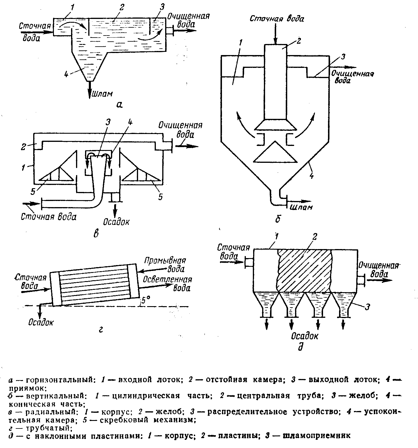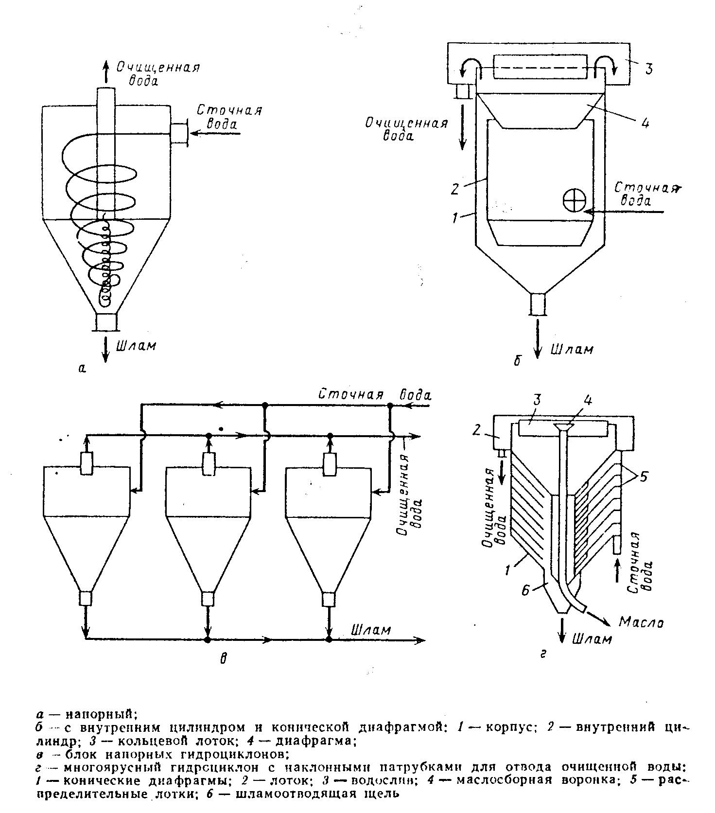 Рисунок 3 – Отстойники. движения воды и выпавшего (всплывшего) осадка, отстойники делятся на прямоточные, в которых направления движения воды и осадка совпадают; противоточные, в которых вода и осадок движутся навстречу друг другу; перекрестные, в которых вода движется перпендикулярно к направлению движения осадка. Наиболее широкое распространение получили пластинчатые противоточные отстойники. Достоинства трубчатых и пластинчатых отстойников - их экономичность вследствие небольшого строительного объема, возможность применения пластмасс, которые легче металла и не корродируют в агрессивных средах. Общий недостаток тонкослойных отстойников - необходимость создания емкости для предварительного отделения легко отделимых нефтяных частиц и больших сгустков нефти, окалины, песка и др. Сгустки имеют нулевую плавучесть, их диаметр может достигать 10-15 см при глубине в несколько сантиметров. Такие сгустки очень быстро выводят из строя тонкослойные отстойники. Если часть пластин или труб будет забита подобными сгустками, то в остальных повысится расход жидкости. Такое положение приведет к ухудшению работы отстойника. Принципиальные схемы отстойников приведены на рисунке 3. 3.1.3 Гидроциклоны Осаждение взвешенных частиц под действием центробежной силы проводят в гидроциклонах и центрифугах. Для очистки сточных вод используют напорные и открытые (безнапорные) гидроциклоны. При вращении жидкости в гидроциклонах на частицы действуют центробежные силы, отбрасывающие тяжелые частицы к периферии потока, силы сопротивления движущегося потока, гравитационные силы и силы инерции. Силы инерции незначительны и ими можно пренебречь. При высоких скоростях вращения центробежные силы значительно больше сил тяжести. 3.1.3.1 Напорные гидроциклоны В напорные гидроциклоны вода подается через тангенциально направленный патрубок в цилиндрическую часть. В гидроциклоне вода, двигаясь по винтовой спирали наружной стенки аппарата, направляется в коническую его часть. Здесь основной поток изменяет направление движения и перемещается к центральной части аппарата. Поток осветленной воды в центральной части аппарата по трубе выводится из гидроциклона, а тяжелые примеси вдоль конической части перемещаются вниз и выводятся через патрубок шлама (рисунок 4а). Промышленность выпускает напорные гидроциклоны нескольких типоразмеров. Для грубой очистки применяют гидроциклоны больших диаметров. Эффективность гидроциклонов находится на уровне 70%. Гидроциклоны малого диаметра объединяют в общий агрегат, в котором они работают параллельно (рисунок 4б). 3.1.3.2 Безнапорные гидроциклоны Одним из технических приспособлений для сбора нефтяной пленки с поверхности воды является безнапорный гидроциклон. Если в предыдущих конструкциях для вращения жидкости в гидроциклоне применяли подачу воды в гидроциклон по патрубку, расположенному по касательной в цилиндрической части, то в данном случае проводят отсос воды из гидроциклона по патрубку, расположенному по касательной внизу конической части гидроциклона. Такое расположение патрубка дает возможность образовывать внутри гидроциклона вращение жидкости, причем поступление воды из водоема происходит в верхней части гидроциклона. Собранная с поверхности воды пленка нефтепродуктов, попадая в гидроцик
