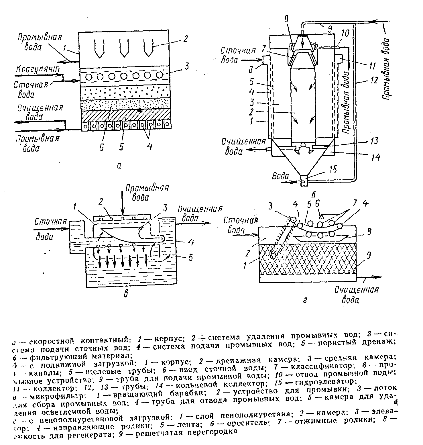 Рисунок 4 – Гидроциклоны. 3.1.3.3 Центрифуги Для удаления осадков из сточных вод могут быть использованы фильтрующие или отстойные центрифуги. Центробежное фильтрование достигается вращением суспензии в перфорированном барабане, обтянутом сеткой или фильтровальной тканью. Осадок остается на стенках барабана. Его удаляют вручную или ножевым съемом. Такое фильтрование наиболее эффективно, когда надо получать продукт наименьшей влажностью и требуется промывка осадка. Центрифуги могут быть периодического или непрерывного действия; горизонтальными, вертикальными или наклонными; различаются по расположению вала в пространстве; по способу выгрузки осадка из ротора (с ручной, с ножевой, поршневой или центробежной выгрузкой). Они могут быть в герметизированном и негерметизированном исполнении. 3.1.4 Фильтры Метод фильтрования приобретает все большее значение в связи с повышением требований к качеству очищенной воды. Фильтрование применяют после очистки сточных вод в отстойниках или после биологической очистки. Процесс основан на прилипании грубодисперсных частиц нефти и нефтепродуктов к поверхности фильтрующего материала. Фильтры по виду фильтрующей среды делятся на тканевые или сетчатые, каркасные или намывные, зернистые или мембранные. Фильтрование через различные сетки и ткани обычно применяют для удаления грубо дисперсных частиц. Более глубокую очистку нефтесодержащей воды можно осуществлять на каркасных фильтрах. Пленочные фильтры очищают воду на молекулярном уровне. 3.1.4.1 МикрофильтрыМикрофильтры представляют собой фильтровальные аппараты, в качестве фильтрующего элемента использующие металлические сетки, ткани и полимерные материалы. Микрофильтры обычно выпускают в виде вращающихся барабанов, на которых неподвижно закреплены или прижаты к барабану фильтрующие материалы. Барабаны выпускают диаметром 1,5-3 м и устанавливают горизонтально. Очищаемая вода поступает внутрь барабана и фильтруется через фильтр наружу. Микрофильтры широко используют для осветления природных вод. В промышленности применяют микрофильтры различных конструкций. Процесс фильтрации происходит только за счет разности уровней воды внутри и снаружи барабана. Полотно сетки не закреплено, а лишь охватывает барабан в виде бесконечной ленты, натягиваемой с помощью натяжных роликов. Микросетки изготовляют из различных материалов: капрона, латуни, никеля, нержавеющей стали, фосфористой бронзы, нейлона и др. 3.1.4.2 Каркасные фильтрыФильтровальные процессы на каркасных фильтрах можно разделить на три большие группы: