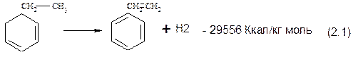 2.3 Технологическая схема отделение дегидрирования.Этилбензольная шихта (ЭБШ) – смесь свежего этилбензола с заводского склада ЛВЖ и возвратного этилбензола из емкости, отделения промпродуктов, насосами подается в испаритель поз. 204 с регулированием расхода через кожухотрубчатый теплообменник поз. 209, где подогревается до 70-95 0С водным конденсатом, проходящим по трубному пространству. Часть ЭБШ постоянно подается на промышленный хроматограф со сбросом на всос насосов. В поз. 204 (кожухотрубчатый теплообменник) ЭБШ нагревается до температуры кипения, испаряется и частично перегревается. Для снижения температуры кипения ЭБШ испарение осуществляют в токе водяного пара. Расход пара на смешение в трубном пространстве поз. 204 поддерживается регулятором в количестве 10-15% от подачи ЭБШ. Испарение осуществляется за счет тепла конденсации водяного пара, подаваемого в межтрубное пространство испарителя. Пары ЭБШ с температурой 150-160 0С, регулируемой расходом пара на испарение, поступают из испарителя в трубное пространство перегревателя поз.203, где нагреваются за счет тепла перегретого водяного пара, поступающего из межступенчатого подогревателя. Перегретые пары ЗБШ из поз. 203 поступают в смесительную камеру реактора поз. 202, где смешиваются с перегретым водяным паром (не более 750°С) в соотношении I : - 3,5, поступающим из печи поз. 201/11, состоящей из двух радиантных камер и одной конвекционной камеры, объединенных в один блок. Реактор поз. 202 – вертикальный цилиндрический аппарат, состоящий из двух ступеней, с промежуточным подводом тепла в межступенчатом подогревателе. В каждой ступени реактора находится слой катализатора с содержанием оксида железа, небольшого количества соединений калия, рубидия, циркония. Для равномерного распределения пароэтилбензольной смеси перед слоями катализатора предусмотрены распределительные устройства. В реакторе происходит каталитический процесс адиабатического двухступенчатого дегидрирования этилбензола в стирол в токе водяного пара с промежуточным подогревом контактного газа. Давление на входе в I ступень – не более I ати, на выходе из I ступени – не более 0,6 ати. При завышении давления до I ати включается звуковая и световая сигнализация. Температура пароэтилбензольной смеси на входе в 1 ступень реактора 550-6400С за счет эндотермической реакции и теплопотерь температура выходящего из реактора поз. 202/1 контактного газа понижается. Далее контактный газ подогревается в межступенчатом подогревателе до температуры 550-6300 с водяным паром и поступает на 2 ступень реактора поз. 202/2, где продолжается дегидрирование при прохождении газа через слой катализатора. Контактный газ из реактора поступает в котел-утилизатор поз. 205/1-2, где его тепло используется для получения вторичного водяного пары давлением 3-4,5 ати. Об отклонениях уровня в котлах от пределов 50-70% подается звуковой и световой сигналы на ЦПУ. При завышении давления контактный газ перед аппаратом поз. 209 более 0,2 ати подается звуковой и световой сигналы, срабатывает блокировка и закрываются отсечные клапаны на трубопроводах подачи пара и топливного газа в печь поз. 201, ЭБШ – в испаритель поз.204, и открывается отсечной клапан на трубопроводе контактного газа от сепаратора поз. 212 в гидрозатвор поз. 234. Далее контактный газ, охлажденный до температуры н