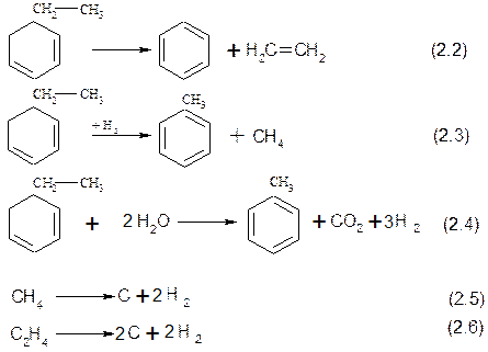 Одновременно идут реакции дегидроконденсации с получением полициклических соединений – двухзамещенных стильбенов, фенантренов, нафталинов. Углерод, образующийся при разделении углеводородов, удаляется с катализатора водяным паром:
