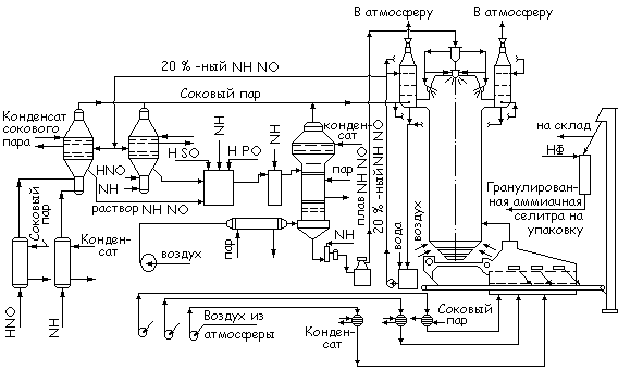 В промышленности широко применяется только метод получения аммиачной селитры из синтетического аммиака и разбавленной азотной кислоты. Метод получения аммиачной селитры из аммиака коксового газа и разбавленной азотной кислоты перестали применять как экономически невыгодный. Производство аммиачной селитры является многостадийным. В связи с этим пытались получать аммиачную селитру непосредственно из аммиака, окислов азота, кислорода и паров воды по реакции: 4NH3 + 4NO2 + O2 + 2H2O = 4NH4NO3. Однако от этого способа пришлось отказаться, так как наряду с аммиачной селитрой образовывался нитрит аммония – неустойчивый и взрывоопасный продукт. В небольших количествах аммиачную селитру получают путём обменного разложения солей (конверсионные способы) по реакциям: Ca(NO3)2 + (NH4)2CO3 = 2NH4NO3 + ↓CaCO3 Mg(NO3)2 + (NH4)2CO3 = 2NH4NO3 + ↓MgCO3 Ba(NO3)2 + (NH4)2CO4 = 2NH4NO3 + ↓BaCO4 NaNO3 + (NH4)2CO4 = 2NH4NO3 + Na2SO4 Технологическая схема агрегата АС–72 представлена на рис 1. прил.А. Аппаратурное оформление процесса. Аппарат ИТН предназначен для получения раствора аммиачной селитры путём нейтрализации 58 – 60 % азотной кислоты газообразным аммиаком с использованием тепла реакции для частичного выпаривания воды из раствора под атмосферным давлением по реакции: NH3 + HNO3 = NH4NO3 + Qккал Безопасность процесса нейтрализации обеспечивается автоматическими блокировками, прекращающими подачу сырья в аппараты ИТН при нарушениях соотношения расходов азотной кислоты и газообразного аммиака или при росте температуры в реакционной зоне выше 180 0С; в последнем случае в ИТН автоматически подаётся конденсат водяного пара. Подогреватель азотной кислоты предназначен для подогрева 58 – 60 % азотной кислоты от температуры, при которой он хранится на складе, до температуры 80 – 90 0С за счёт тепла сокового пара из аппарата ИТН. Подогреватель газообразного аммиака предназначен для нагрева аммиака до 120 – 180 0С. Донейтрализатор предназначен для донейтрализации аммиаком избыточной кислотности раствора аммиачной селитры, непрерывно поступающего из аппарата ИТН, и вводимых в качестве добавки серной и фосфорной кислот. Выпарной аппарат в нём получают высококонцентрированный плав в одну ступень. Подогреватель воздуха выпарного аппарата. Выпарной аппарат предназначен для выпарки разбавленных растворов от 30 – 50 до 92 % под атмосферным давлением. Промывное и фильтрующее оборудование предназначены для отмывки пыли аммиачной селитры, уносимой воздухом из башни, аэрозольных частиц аммиачной селитры из паро-воздушной смеси выпарного аппарата, воздуха из башен, сокового пара из аппаратов ИТН, а также аммиака из этих потоков. Нагнетатель воздуха в выпарной аппарат центробежного типа. Воздуходувки используются для охлаждения аммиачной селитры устанавливаются 3 высоконапорных центробежных вентилятора. Вытяжные вентиляторы для отсоса паро-воздушной смеси после промывных скрубберов на грануляционных башнях осевого типа. Насосы для перекачивания плава предназначены для перекачивания 99 – 99,9 % плава при 185 0С. Грануляционная башня она состоит из трёх частей: верхняя часть – с потолком и переходником к промывному скрубберу; средняя часть – собственно корпус; нижняя часть – с приёмным конусом. Продукт выгружается на реверсивный конвейер через прямоугольную щель в нижнем корпусе. Аппарат для охлаждения гранул в кипящем слое предназ