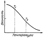 Рис.1. Схематическая диаграмма вязкости термопластичных полимеров в зависимости от температуры: Т1 – температура перехода из стеклообразного в высоко эластичное состояние, Т2 – температура перехода из высокоэластичного в вязкотекучее состояние. Поскольку единственным следствием нагрева является изменение пластичности, линейные полимеры называют термопластичными. Не следует думать, что термин «линейные» обозначает прямолинейные, наоборот, для них более характерна зубчатая или спиральная конфигурация, что придает таким полимерам механическую прочность. Термопластичные полимеры можно не только плавить, но и растворять, так как связи Ван-дер-Ваальса легко рвутся под действием реагентов. Разветвленные (привитые) полимеры более прочны, чем линейные. Контролируемое разветвление цепей служит одним из основных промышленных методов модификации свойств термопластичных полимеров. Сетчатая структура характерна тем, что цепи связаны друг с другом, а это сильно ограничивает движение и приводит к изменению как механических, так и химических свойств. Обычная резина мягка, но при вулканизации серой образуются ковалентные связи типа S-0, и прочность растет. Полимер может приобрести сетчатую структуру и спонтанно, например, под действием света и кислорода произойдет старение с потерей эластичности и работоспособности. Наконец, если молекулы полимера содержат реакционно-способные группы, то при нагревании они соединяются множеством прочных поперечных связей, полимер оказывается сшитым, т. е. приобретает пространственную структуру. Таким образом, нагрев вызывает реакции, резко и необратимо изменяющие свойства материала, который приобретает прочность и высокую вязкость, становится нерастворимым и неплавким. Вследствие большой реакционной способности молекул, проявляющейся при повышении температуры, такие полимеры называют термореактивными.