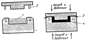Рис.5. Схематическое изображение пресс-формы, используемой в процессе прямого формования 1 — полость формы, наполненная термореактивным материалом; 2 — направляющие шипы; 3 — заусенец; 4 - сформованное изделие Температура и давление при прессовании могут достигать 200 °С и 70 кг/см2 соответственно. Рабочие температура и давление определяются реологическими, термическими и другими свойствами прессуемого пластического материала. Выемка пресс-формы полностью заполняется полимерным компаундом. Когда под давлением пресс-форма закрывается, материал внутри нее сдавливается и прессуется в требуемую форму. Избыточный материал вытесняется из пресс-формы в виде тонкой пленки, которую называют "заусенец". Под действием температуры прессуемая масса отвердевает. Для освобождения конечного продукта из пресс-формы охлаждения не требуется.