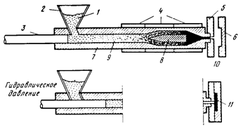 пресс-форма плотно закрывается, и в это время происходит вспрыскивание