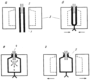 Рис..6. Схематическое изображение процесса литья под давлением 1 — компаундированный пластический материал; 2 — загрузочная воронка; 3 — поршень; 4 — электрический нагревательный элемент; 5 — стационарная часть формы; 6 — подвижная часть формы; 7 — основной цилиндр; 8 - торпеда; 9 - размягченный пластический материал; 10 — пресс-форма; 11 - изделие, сформованное методом литья под давлением 2.6 ФОРМОВАНИЕПНЕВМОФОРМОВАНИЕ. Большое количество полых пластических изделий производят методом пневмоформования: канистры, мягкие бутылки для напитков и пр. Пневмоформованию могут быть подвергнуты следующие термопластичные материалы: полиэтилен, поликарбонат, поливинилхлорид, полистирол, найлон, полипропилен, акрилы, акрилонитрил, акрилонитрил-бутадиенсти-рольнын полимер, однако по ежегодному потреблению первое место занимает полиэтилен высокой плотности.Пневмоформование ведет свое происхождение от стеклодувной промышленности. Схема этого процесса дана на рис.7. Горячую размягченную термопластичную трубку, называемую "заготовкой", помещают внутрь полой формы, состоящей из двух частей. Когда форма закрыта, обе ее половины зажимают один конец заготовки и иглу для подачи воздуха, расположенную на другом конце трубки.