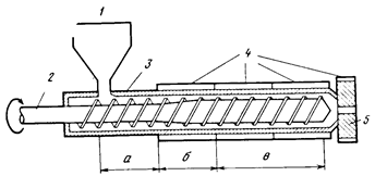 Рис.7. Схематическая диаграмма, объясняющая стадии процесса пневмоформования а — заготовка, помещенная в открытую пресс-форму; б — закрытая пресс-форма; в — вдувание воздуха в пресс-форму; г — открывание пресс-формы. 1— заготовка; 2 - игла для подачи воздуха; 3 - пресс-форма; 4 - воздух; 5 - изделие, изготовленное методом пневмоформования Под действием давления, подаваемого из компрессора через иглу, горячая заготовка раздувается как шар до плотного соприкосновения с относительно холодной внутренней поверхностью формы. Затем форму охлаждают, открывают и вынимают готовое твердое термопластичное изделие. Заготовка для пневмоформования может быть получена методом литья под давлением или экструзии, и в зависимости от этого метод называют соответственно литьем под давлением с раздувкой или пневмоформованием с экструзией. ФОРМОВАНИЕ ЛИСТОВЫХ ТЕРМОПЛАСТОВ. Формование листовых термопластов является чрезвычайно важным процессом для производства трехмерных изделий из пластиков. Этим методом из листов акрилонитрилбутадиенстирола получают даже такие крупные изделия, как корпуса подводных лодок. Схема этого Процесса такова. Термопластичный лист нагревают до температуры его размягчения. Затем пуансон впрессовывает горячий гибкий лист в матрицу металлической пресс-формы (рис.9), при этом лист принимает определенную форму. При охлаждении сформованное изделие затвердевает и извлекается из пресс-формы. В модифицированном методе под действием вакуума горячий лист засасывается в полость матрицы и принимает требуемую форму (рис.10). Этот метод называется методом вакуумного формования. 2.7 ЭКСТРУЗИЯ Экструзия является одним из самых дешевых методов производства широко распространенных пластических изделий, таких, как пленки, волокна, трубы, листы, стержни, шланги и ремни, причем профиль этих изделий задается формой выхлопного отверстия головки экструдера. Расплавленный пластик при определенных условиях выдавливают через выходное отверстие головки экструдера, что и придает желаемый профиль экструдату. Схема простейшей экструзионной машины показана на рис.8. Рис 8. Схематическое изображение простейшей экструзионной машины 1 — загрузочная воронка; 2 - шнек; 3 - основной цилиндр; 4 — нагревательные элементы; 5 — выходное отверстие головки экструдера, а — зона загрузки; б — зона сжатия; в ~ зона гомогенизации В этой машине порошок или гранулы компаундированного пластического материала загружают из бункера в цилиндр с электрическим обогревом для размягчения полимера. Спиралевидный вращающийся шнек обеспечивает движение горячей пластической массы по цилиндру. Поскольку при движении полимерной массы между вращающимся шнеком и цилиндром возникает трение, это приводит к выделению тепла и, следовательно, к повышению температуры перерабатываемого полимера. В процессе этого движения от бункера к выходному отверстию головки экструдера пластическая масса переходит три четко разделенные зоны: зону загрузки (а), зону сжатия (б) и зону гомогенизации (в) (см. рис 9). Каждая из этих зон вносит свой вклад в процесс экструзии. Зона загрузки, например, принимает полимерную массу из бункера и направляет ее в зону сжатия, эта операция проходит без нагревания.