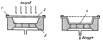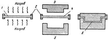Рис. 9. Схема процесса формования листовых термопластов 1 — лист термопластического материала; 2 — зажим; 3 — пуансон; 4 — размягченный нагревом лист; 5 — матрица; 6 — изделие, полученное методом формования листовых термопдастов