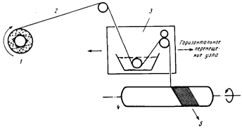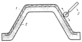 Рис.12. Схематическое изображение метода наслоения листов вручную 1 - чередующиеся слои полимера и стеклоткани; 2 - пресс-форма; 3 - прокатывающий ролик Все это для однородного прижимания стеклоткани к полимеру и удаления пузырьков воздуха плотно прокатывают роликами. Количество чередующихся слоев полимера и стеклоткани определяет толщину образца (рис.12).Затем при комнатной или повышенной температуре происходит отвердение системы. После отвердения армированный пластик снимают с формы и проводят зачистку и окончательную отделку. Этим методом получают листы, части автомобильного кузова, корпуса для судов, трубы и даже фрагменты зданий.МЕТОД НАМАТЫВАНИЯ ВОЛОКОН. Этот метод очень широко используется для производства таких армированных пластических изделий, как цилиндры, выдерживающие высокие давления, цистерны для хранения химических веществ и корпуса моторов ракет. Он состоит в том, что непрерывную мононить, волокно, пучок волокон или тканую ленту пропускают через ванную со смолой и отвердителем. По мере выхода волокна из ванны избыток смолы отжимается. Пропитанные смолой волокна или ленту затем наматывают на сердечник требуемой формы и отверждают под действием температуры.