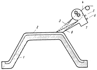 Рис.13. Схематическое изображение метода наматывания волокна 1- подающая катушка; 2 - непрерывная нить; 3 - узел для пропитки волокна и отжима смолы; 4 - сердечник; 5 - пропитанные смолой волокна, намотанные на сердечник Наматывающая машина (рис.13) сконструирована так, чтобы волокна могли наматываться на сердечник определенным образом. Натяжение волокна и способ его наматывания очень важны с точки зрения конечных деформационных свойств готового изделия. МЕТОД ОПРЫСКИВАНИЯ. В этом методе используют пульверизатор с многоручьевой головкой. Струи смолы, отвердителя и нарезанного волокна одновременно подаются из пульверизатора на поверхность формы (рис.14), где они образуют слой определенной толщины. Нарезанное волокно определенной длины получают непрерывной подачей волокон в измельчающую головку аппарата. После достижения требуемой толщины полимерную массу при нагревании отверждают. Распыление является экспресс-методом для покрытия больших поверхностей. Многие современные пластические изделия, такие, как грузовые платформы, резервуары для хранения, кузова грузовиков и корпуса кораблей, получают именно этим методом.