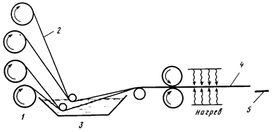 Рис.15. Схематическое изображения метода производства непрерывных слоистых материалов 1— подающие катушки; 2 — непрерывные листы стеклоткани; 3 — ванна для пропитки в смеси смолы с отвердителем; 4 - непрерывный слоистый пластик; 5 - слоистый пластик, нарезаемый на куски необходимого размера Другой метод, известный как метод получения одноосно ориентированного волокнистого пластика, позволяет изготовить из непрерывных пучков волокон такие изделия, как полые прутья или рыболовные удочки. Этот процесс сравнительно прост. Непрерывный пучок волокон, предварительно обработанный смолой и отвердителем, протягивают через фильеру соответствующего профиля (рис.16), нагретую до определенной температуры. На выходе из фильеры профилированное изделие продолжают нагревать. Отвержденный профиль вытягивают из фильеры системой вращающихся валков. Этот процесс несколько напоминает экструзию с той лишь разницей, что при экструзии полимерный материал проталкивают через фильеру изнутри с помощью вращающегося шнека, а в описанном методе материал протягивают через выходное отверстие фильеры с внешней стороны.