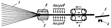 Рис.16. Схематическое изображение метода получения одноосно ориентированного волокнистого пластика 1 — непрерывный пучок волокон, пропитанный смолой и отвердителем; 2 — нагревательный элемент; 3 — фильера; 4 — вращающиеся вытягивающие валки; 5 — готовое изделие, нарезанное на куски; 6 — профиль готового изделия Кроме того, смесь, содержащая нарезанные волокна, смолу и отвердитель, может быть сформована любым другим подходящим методом, например методом прямого прессования. Термопластичные материалы, наполненные нарезанными волокнами, могут быть сформованы прямым прессованием, литьем под давлением или экструзией для получения конечного продукта с улучшенными механическими свойствами. 2.10 ПРЯДЕНИЕ ВОЛОКОН Полимерные волокна получают в процессе, называемом прядением. Существуют три принципиально различных метода прядения: прядение из расплава, сухое и мокрое прядение. В процессе прядения из расплава полимер находится в расплавленном состоянии, а в других случаях - в виде растворов. Однако во всех этих случаях полимер, в расплавленном или растворенном состоянии, протекает через многоканальный мундштук, представляющий собой пластину с очень мелкими отверстиями для выхода волокон. ПРЯДЕНИЕ ИЗ РАСПЛАВА. В своей простейшей форме процесс прядения из расплава может быть представлен следующим образом. Первоначально полимерные чешуйки расплавляют на нагретой решетке, превращая полимер в вязкую подвижную жидкость. Иногда в процессе нагревания происходит образование комков вследствие протекания процессов сшивания или термической деструкции. Эти комки могут быть легко удалены из горячего полимерного расплава пропусканием через систему блок-фильтров. Кроме того, для предотвращения окислительной деструкции расплав следует защищать от кислорода воздуха. Это достигается в основном созданием вокруг расплава полимера инертной атмосферы азота, СОд и водяного пара. Дозирующий насос подает расплав полимера с постоянной скоростью на многоканальный мундштук (фильеру). Расплав полимера проходит через систему мелких отверстий мундштука и выходит оттуда в виде непрерывных и очень тонких мононитей. При контакте с холодным воздухом происходит мгновенное затвердевание волокон, выходящих из фильер. Процессы охлаждения и отвердения могут быть в значительной мере ускорены при обдувке холодным воздухом. Выходящие из фильер твердые мононити наматываются на катушки. Важная особенность, которую следует учитывать в процессе прядения из расплава, заключается в том, что диаметр мононити в значительной степени зависит от скорости, с которой расплавленный полимер проходит через фильеру, и от скорости, с которой мононить вытягивают из фильеры и сматывают на катушки.